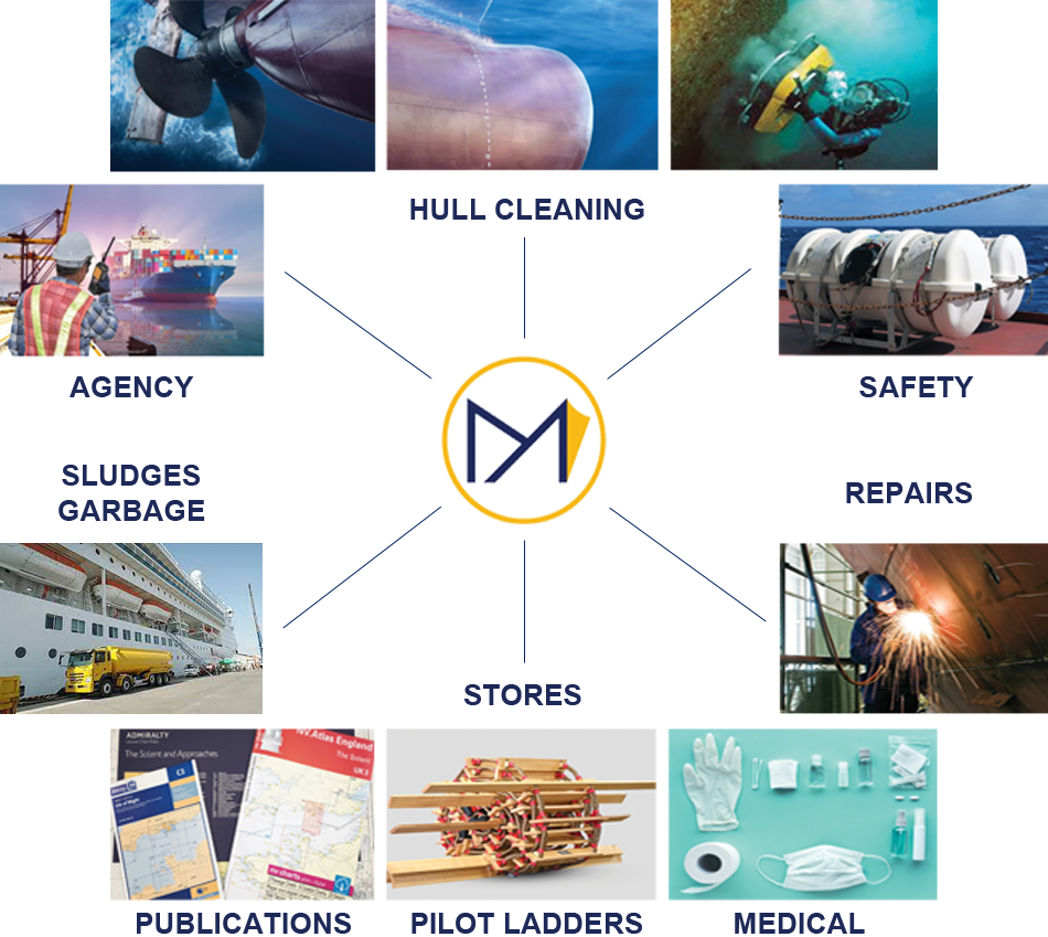 Our supply chain can cover a broad area of any vessel requests such as dry and frozen Provisions, Bonded Stores (Beverages, Cigarettes) Deck, Cabin, Engine, and Safety Stores.